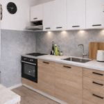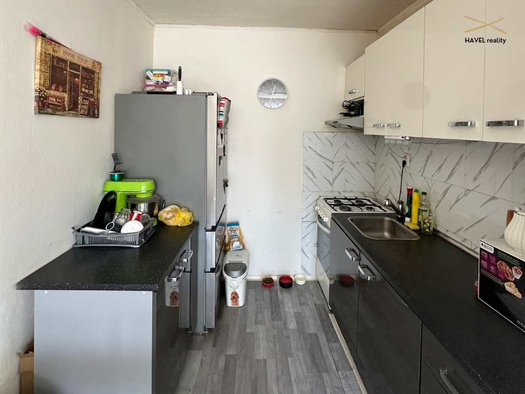 Kuchyň je vybavena plynovým sporákem a elektrickou troubou. Ohřev vody a topení je centrální.