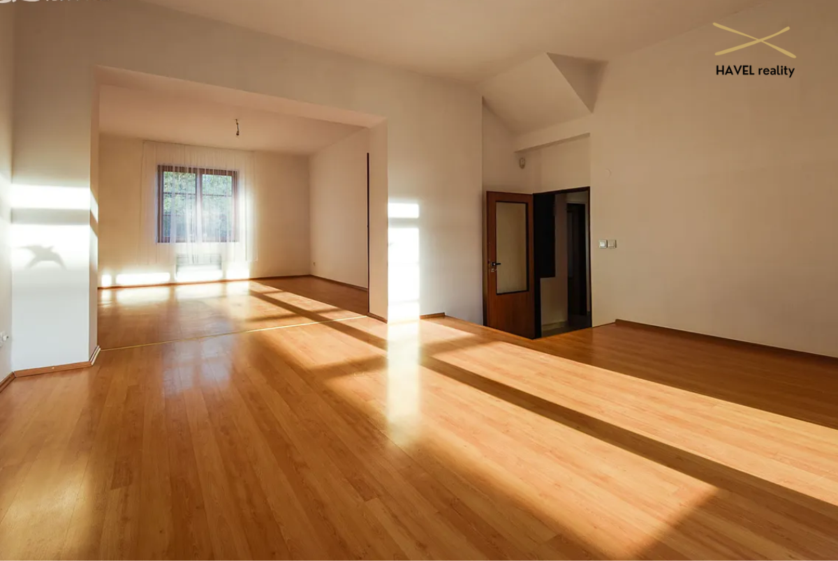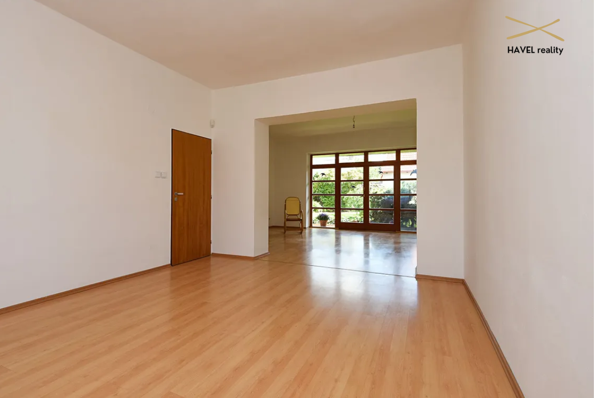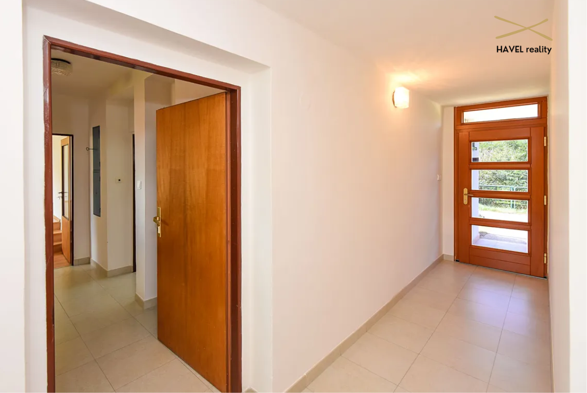Prostorná vstupní chodba (8 m²), hala s novou vestavěnou skříní (9,5 m²), koupelna se sprchovým koutem a WC (7 m²), prádelna (4,5 m²) a zcela nová kuchyň s vestavěnými spotřebiči (elektrická varná deska, trouba, myčka). Velkorysý obývací pokoj s jídelnou o výměře 40 m² je prosvětlený po celý den a nabízí krásný výhled do zahrady a směrem k Modřanské rokli díky velkým francouzským oknům.