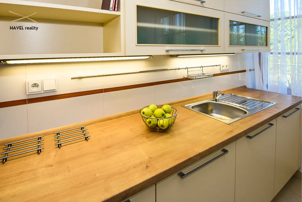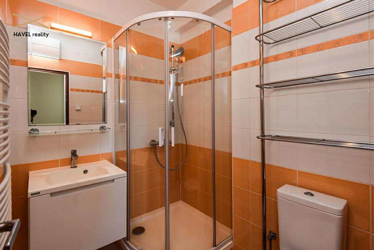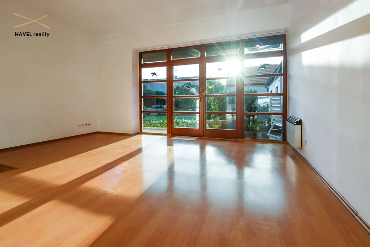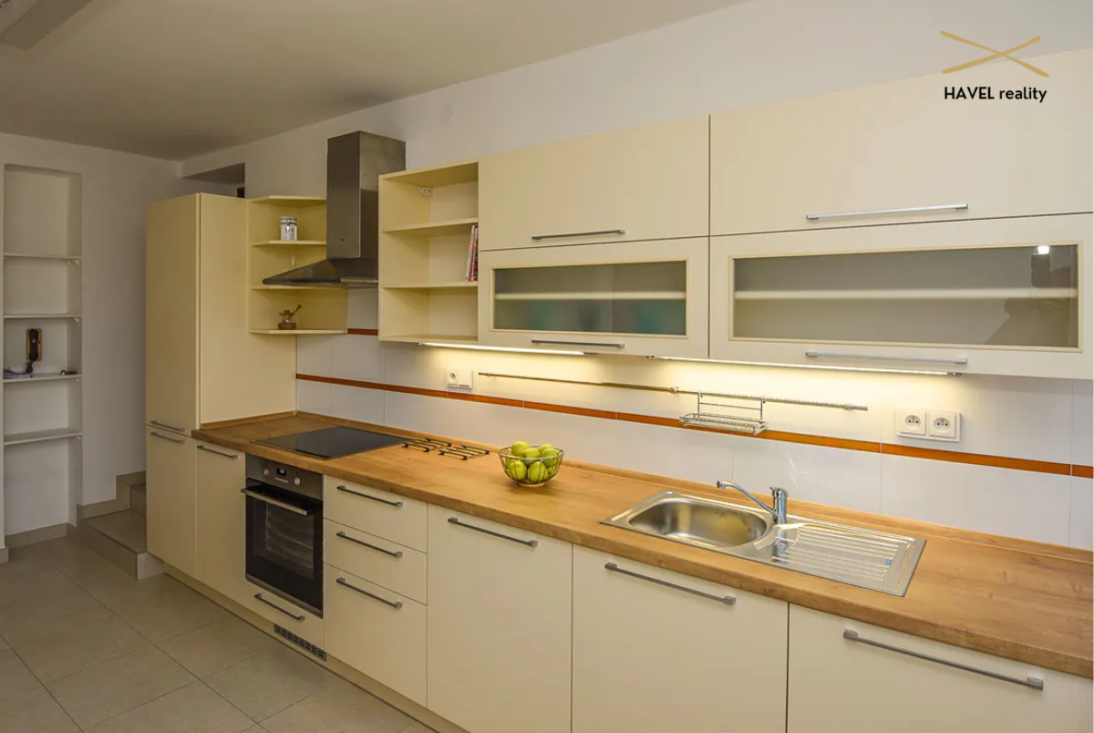 Prostorná vstupní chodba (8 m²), hala s novou vestavěnou skříní (9,5 m²), koupelna se sprchovým koutem a WC (7 m²), prádelna (4,5 m²) a zcela nová kuchyň s vestavěnými spotřebiči (elektrická varná deska, trouba, myčka). Velkorysý obývací pokoj s jídelnou o výměře 40 m² je prosvětlený po celý den a nabízí krásný výhled do zahrady a směrem k Modřanské rokli díky velkým francouzským oknům.