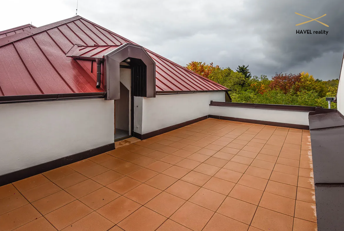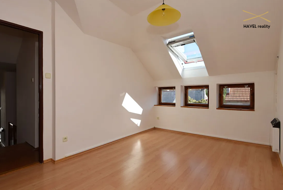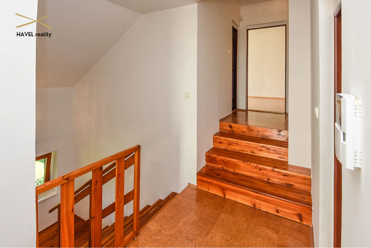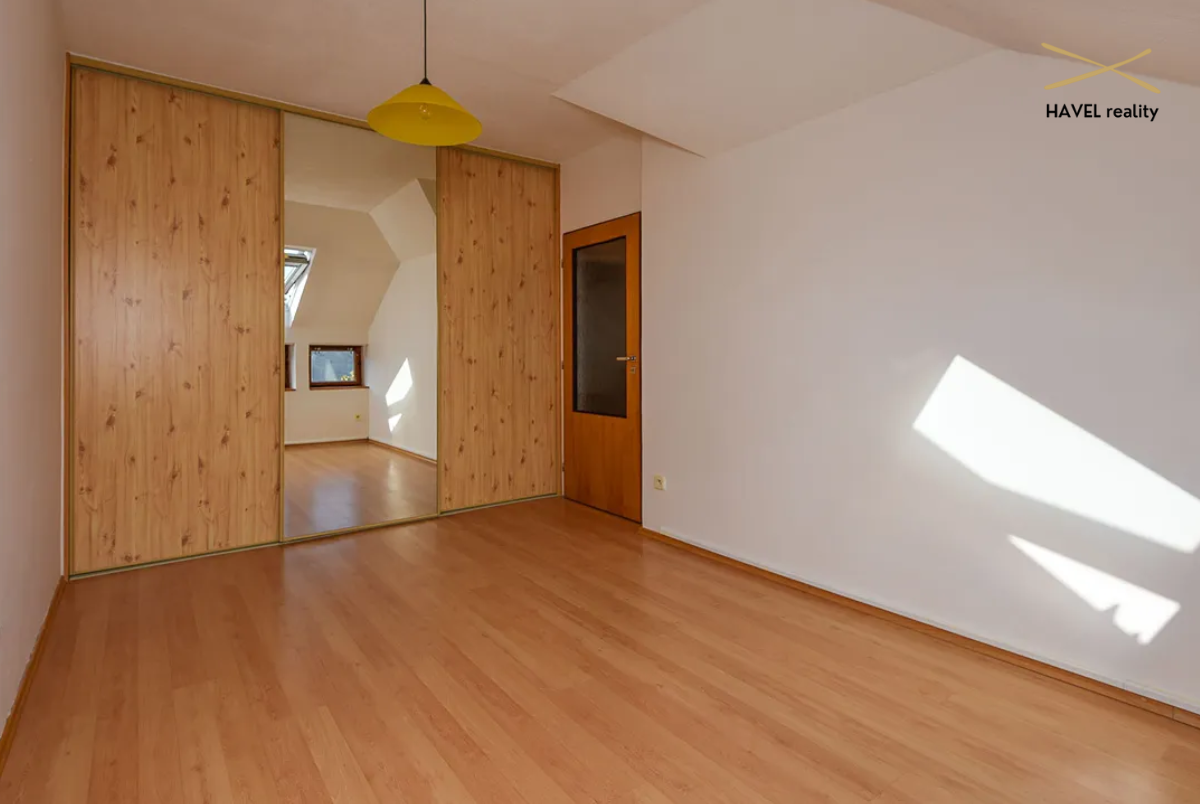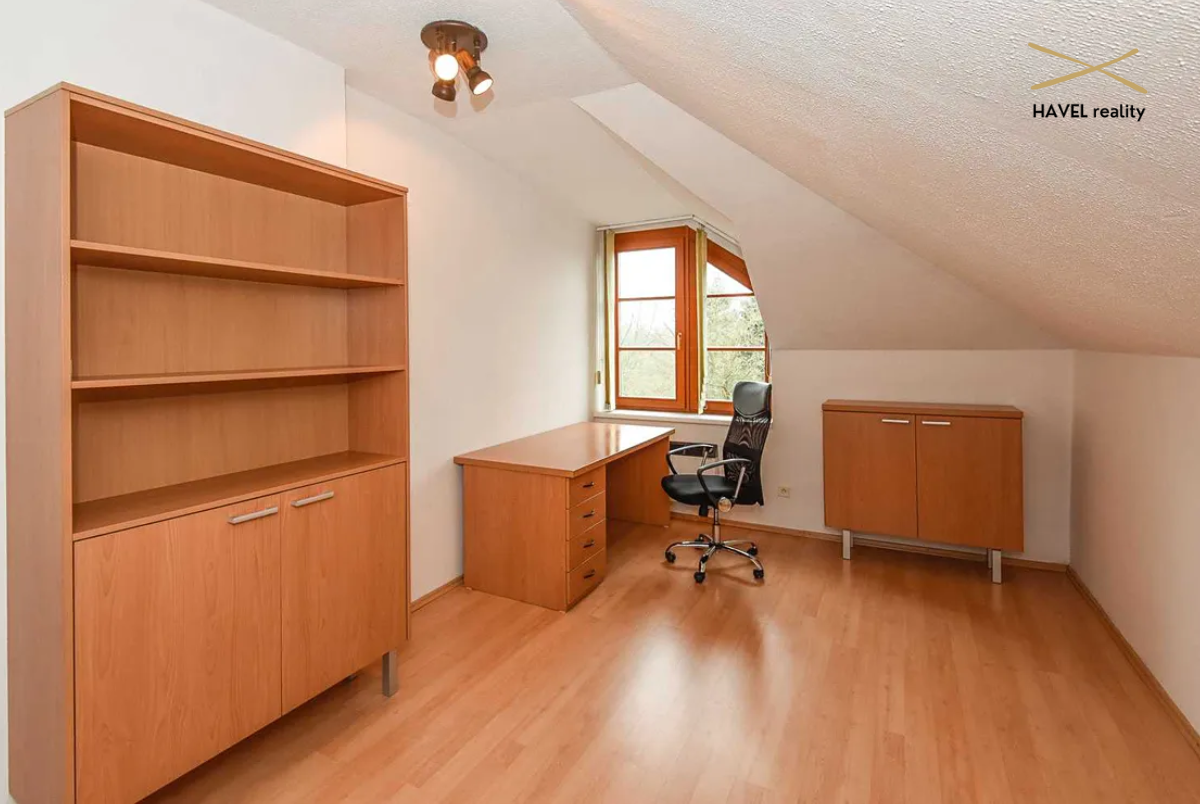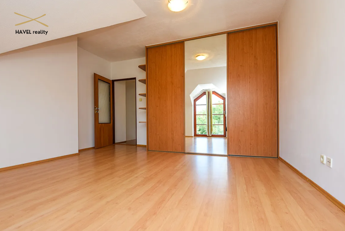 Čtyři pokoje – tři orientované do zeleně Modřanské rokle (19 m², 15 m² a 16 m²) a jeden s výhledem do zahrady (15 m²). Dva pokoje mají prostorné vestavěné skříně a jeden je zařízen jako plně vybavená dvoupracovní home office. V patře je druhá koupelna s vanou, bidetem a toaletou a také komora (6 m²). Velká terasa orientovaná na východ i západ poskytuje nádherné výhledy a naprosté soukromí.