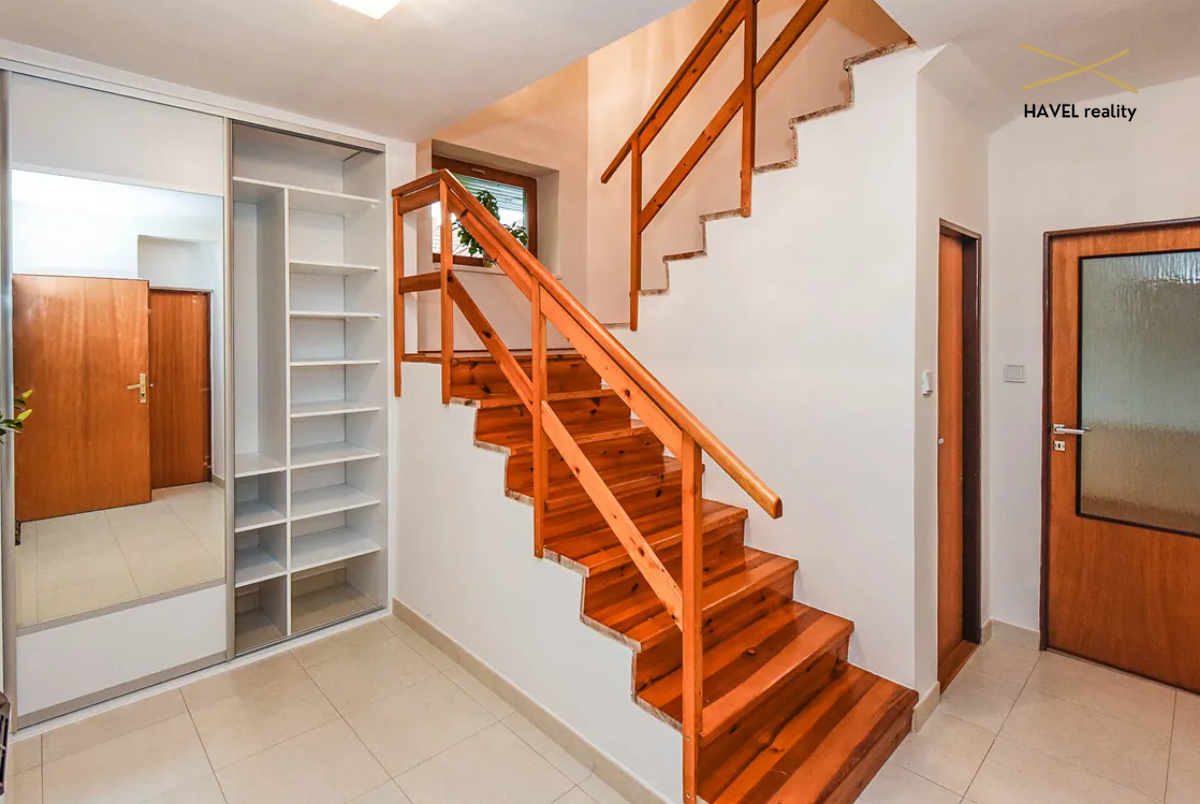 K domu náleží garáž (27 m²), sklep (16 m²) a terasa v 1. patře o výměře 32 m². K dispozici je rovněž vlastní příjezdová komunikace a další parkovací stání před garáží.